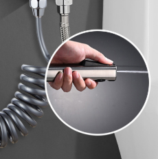 Ten kompletny zestaw rączki bidetowej składa się z wysokiej jakości ręcznej spryskiwacza z tworzywa ABS z 2 regulowanymi trybami wody (silny strumień / delikatny deszcz), zwijanego węża sprężynowego z TPU, zaworu kątowego z litego mosiądzu i uchwytu ściennego ze stopu cynku. Dzięki wielowarstwowemu galwanicznemu wykończeniu, uniwersalnemu interfejsowi G1/2 i 4 opcjom kolorystycznym zapewnia niezawodne działanie w zakresie higieny osobistej, czyszczenia toalet i wielofunkcyjnego użytku domowego.