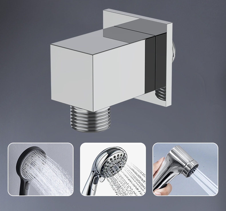 Ten mosiężny, kwadratowy uchwyt prysznicowy to wielofunkcyjne akcesorium łazienkowe, które łączy w sobie uchwyt prysznicowy i funkcję wylotu wody, specjalnie zaprojektowane do ukrytego montażu pryszniców ręcznych, w nowoczesnym, minimalistycznym kształcie sześcianu.